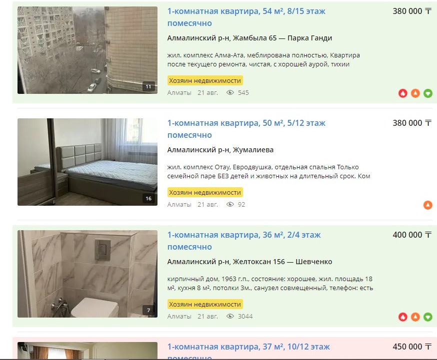 Крыша.кз сайтына кіріп бір бөлмелі пәтерді таба алмайсың. Кемінде 400 мың сұрайды. Бұл бүгінгі таң қаларлық құбылыс емес, аталмыш бағалар көктем-жаз айларының басында да дәл осылай сақталып тұрды. Пәтердің көлемі кішкентай ғана, бір адамға арналған. Студент болсаң, 400 мыңды қайдан табасың? Студентті қойшы, қарапайым жұмысшының өзі қырып ақша тауып отырған жоқ. Бұл ретте арнайы бақылап отыратын орган жоқ. Жекеменшік пәтер иелері дәмеленген бағаларын қойып, ақшаның астында қалып отыр. Бұл сомаға тіпті коммуналдық шығындар да, интернет те кірмейді. Ең өкініштісі, сенімді деген сайтты да алаяқтар басып алған. Өтірік суреттермен халықты тонап жүргендері қаншама.
