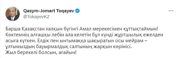 Ел басшысы Қасым-Жомарт Тоқаев барша қазақстандықтарды Амал мерекесімен құттықтады.