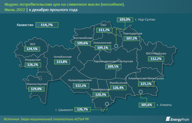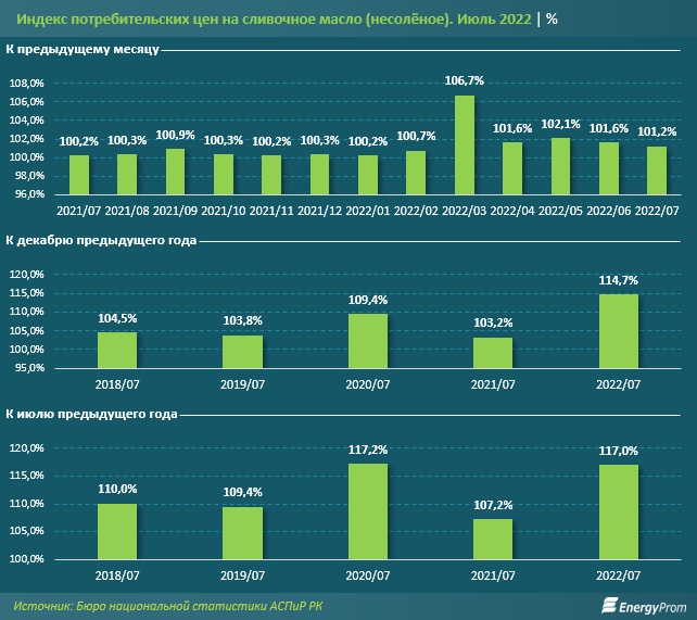 2022 жылғы шілде айы соңында тұзсыз сарымай бағасы 1,2%-ке, жылына 17%-ке өсті. Бұл ретте жыл басынан бері баға 14,7%-ке өсті.