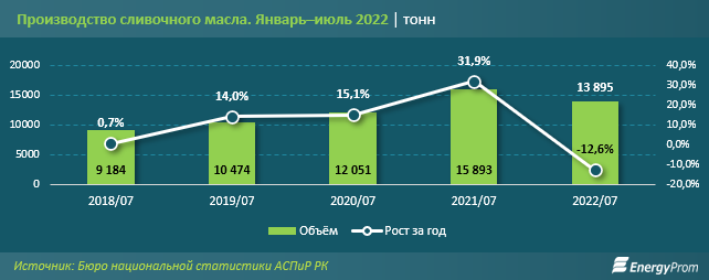Жыл басынан бастап шілде айына дейін елімізде 13,9 мың тонна сарымай өндірілді. Бұл былтырғы жылдың осы кезеңімен салыстырғанда 12,6%-ке аз. Бұған дейін өндіріс көлемі 31,9%-ке өскен.