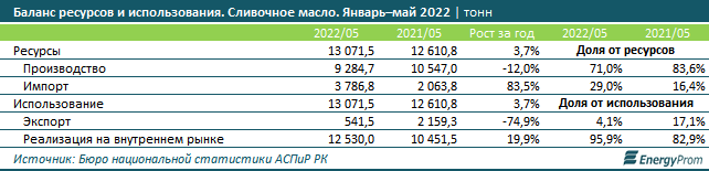 2022 жылғы қаңтар-мамыр айларында отандық май зауыттары сарымай сұранысының 71%-ін қанағаттандырды. Былтыр бұл көрсеткіш 83,6% еді. Бұл айларда (2021 жылғы қаңтар-мамырмен салыстырғанда) өндіріс жылына 12%-ке азайды. Ал импорт, керісінше, бір жылда бірден 83,5%-ке өсті. Бұл импорттаушылардың нарықтағы үлесін 16,4%-тен 29%-ке дейін ұлғайтты.
