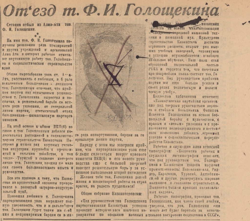 Голощекиннің республикада ұжымдастыру саясатын асқан қатігездікпен жүргізгені бәріне белгілі. Витебск губерниясы Невель ауданының тумасы, кедей еврей отбасынан шыққан Шая Ицикович Голощекин (кейіннен есімі Филипп Исаевич болып өзгерді) 1917 жылға дейін кәсіби революционер болды, одан кейін Уралда жұмыс істеп, патшаның отбасын атуға қатысты. Ал 1925 жылы Сталиннің тапсырмасы бойынша қазақстандық партиялық ұйымды басқарды.