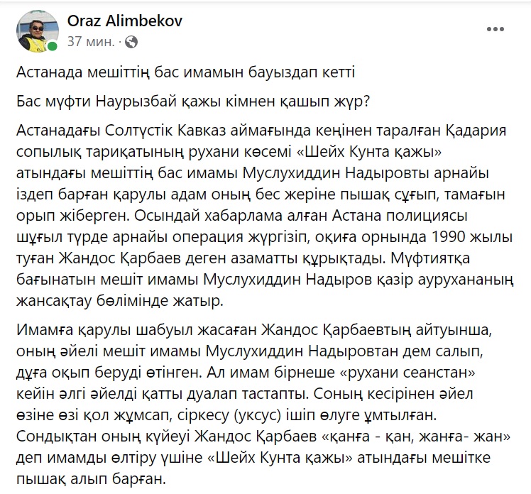 Блогер Ораз Әлімбекұлының жазуынша, зардап шегуші — Астанадағы Солтүстік Кавказ аймағында кеңінен таралған Қадария сопылық тариқатының рухани көсемі «Шейх Кунта қажы» атындағы мешіттің бас имамы Муслухиддин Надыров. Қарулы адам оның бес жеріне пышақ сұғып, тамағын орып жіберген. Осындай хабарлама алған Астана полициясы шұғыл түрде арнайы операция жүргізіп, оқиға орнында 1990 жылы туған Жандос Қарбаев деген азаматты құрықтады. Мүфтиятқа бағынатын мешіт имамы Муслухиддин Надыров қазір аурухананың жансақтау бөлімінде жатыр.