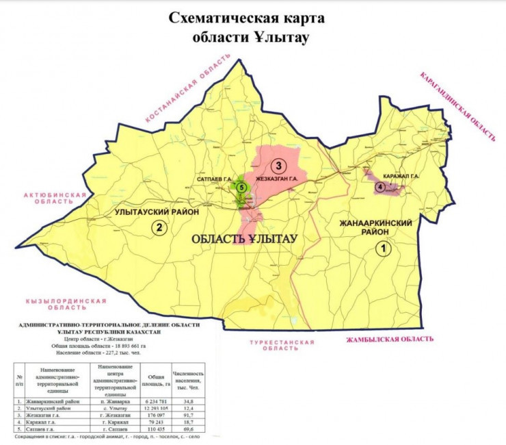 Үкімет Ұлытау облысының құрамына Жезқазған, Сәтбаев және Қаражал қалалары, Жаңаарқа және Ұлытау аудандарының жалпы ауданы 18 миллион 893 мың 661 гектар болатын жерін беріп, Қарағанды облысының шекарасын өзгертуге қаулы етті.